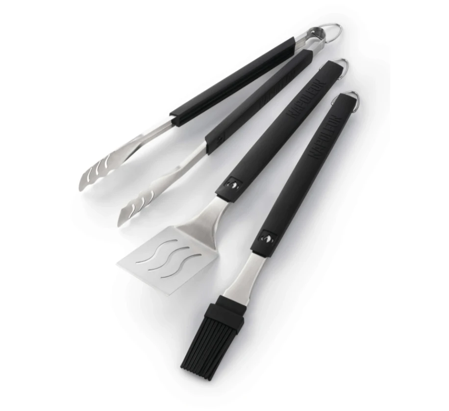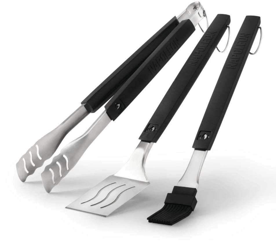 Elegant and easy to use Napoleonโs stainless steel 3-piece tool set has everything you need to master your next barbecue. Easily hang with the oversized loops for storage on your grillโs tool hooks. The silicone basting brush lets you safely slather on the sauce, and cleanup is a breeze because itโs dishwasher safe.