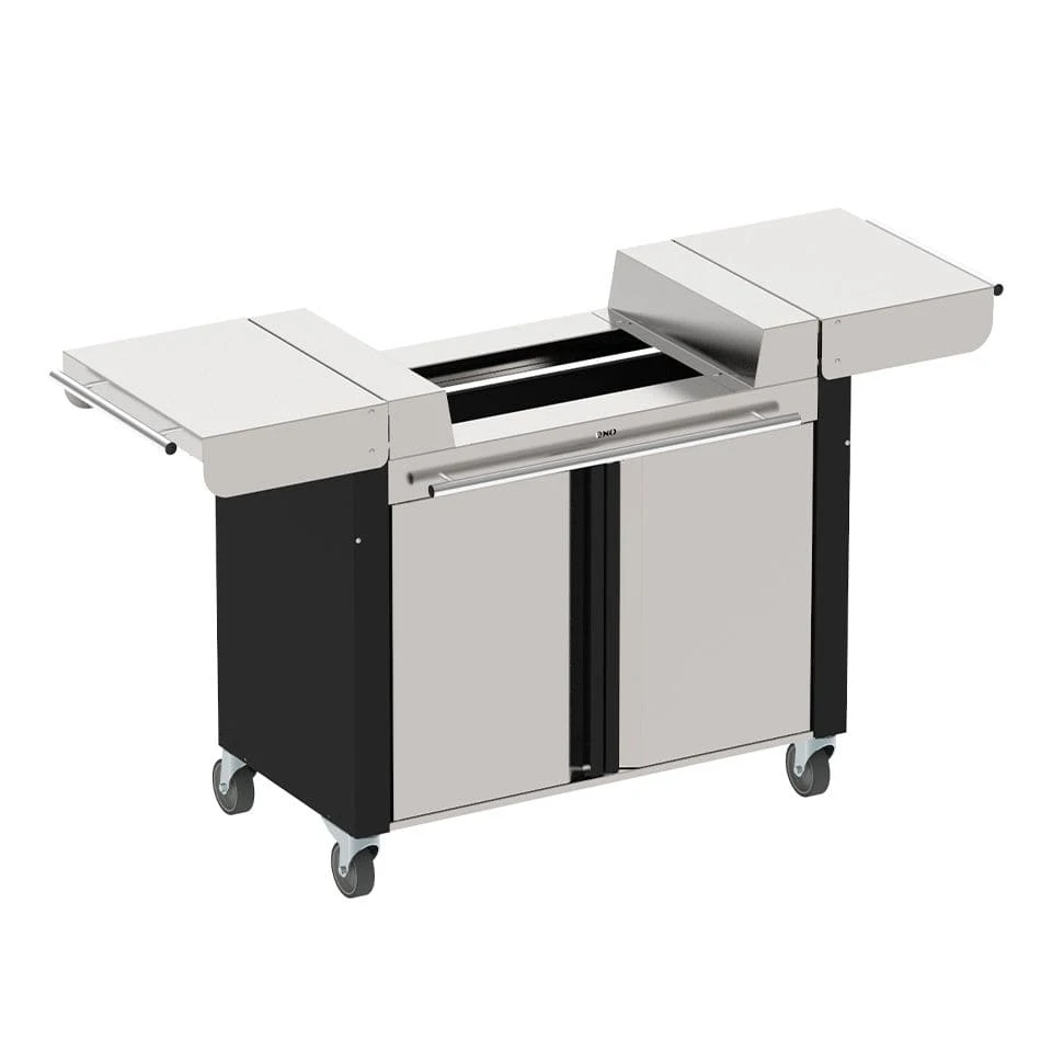 Combo trolley for plancha Elektra 60, Riviera 60 & 75, Chambord 60 & 75 – Stainless steel and blak painted galvanized steel – 2 foldable shelves 2 doors – 4 rotative wheels.