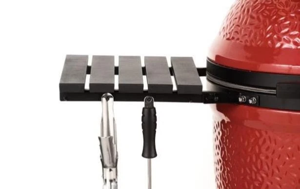 Expand your grilling preparation space with Kamado Joe Aluminum Side Shelves. These side shelves are made from powder coated aluminum for long lasting durability and corrosion resistance, and they can fold down for storage and portability to fit any situation. The shelves also have pegs on the sides for hanging cooking tools and utensils for quick and easy access.
